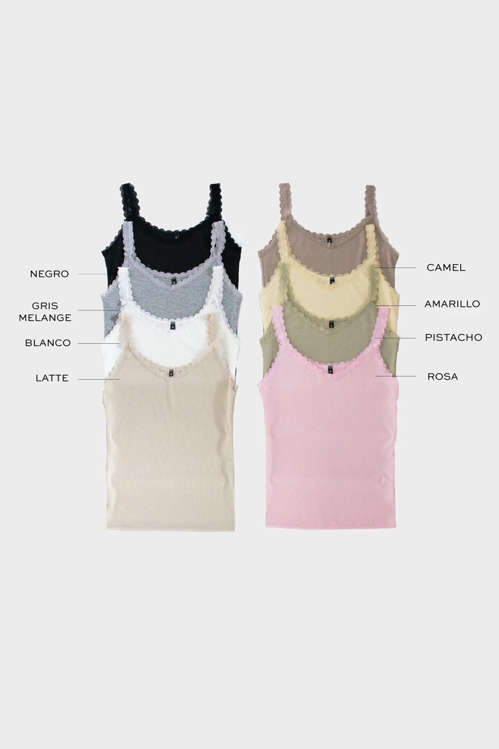 Musculosa de morley viscosa con escote V. Terminación con encaje al tono en sisa, escote y breteles.